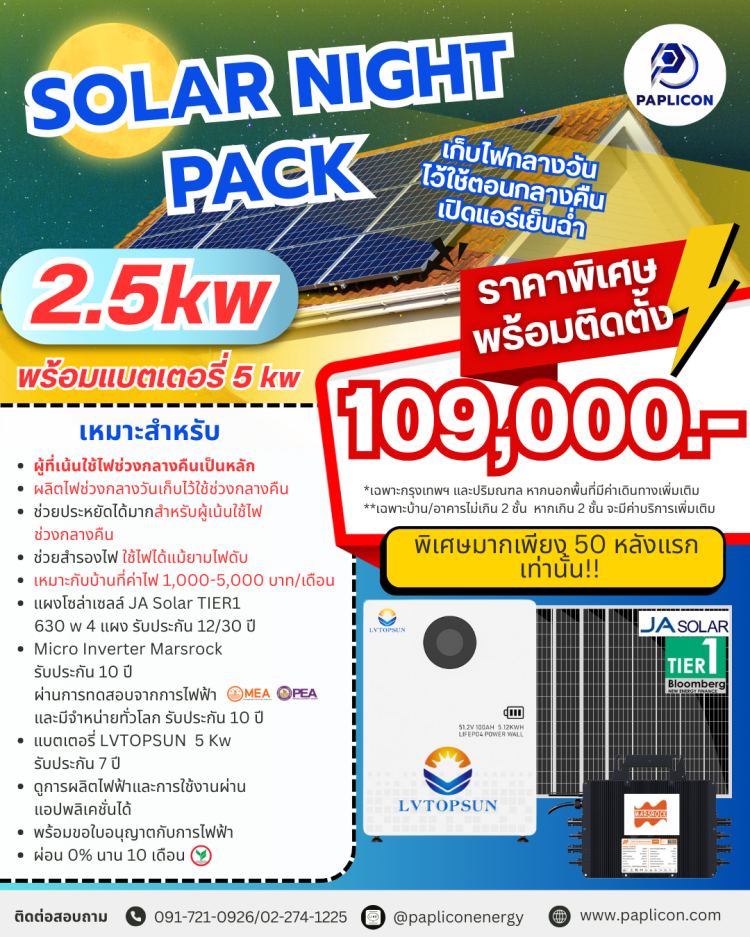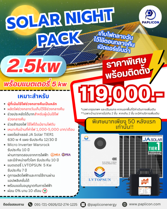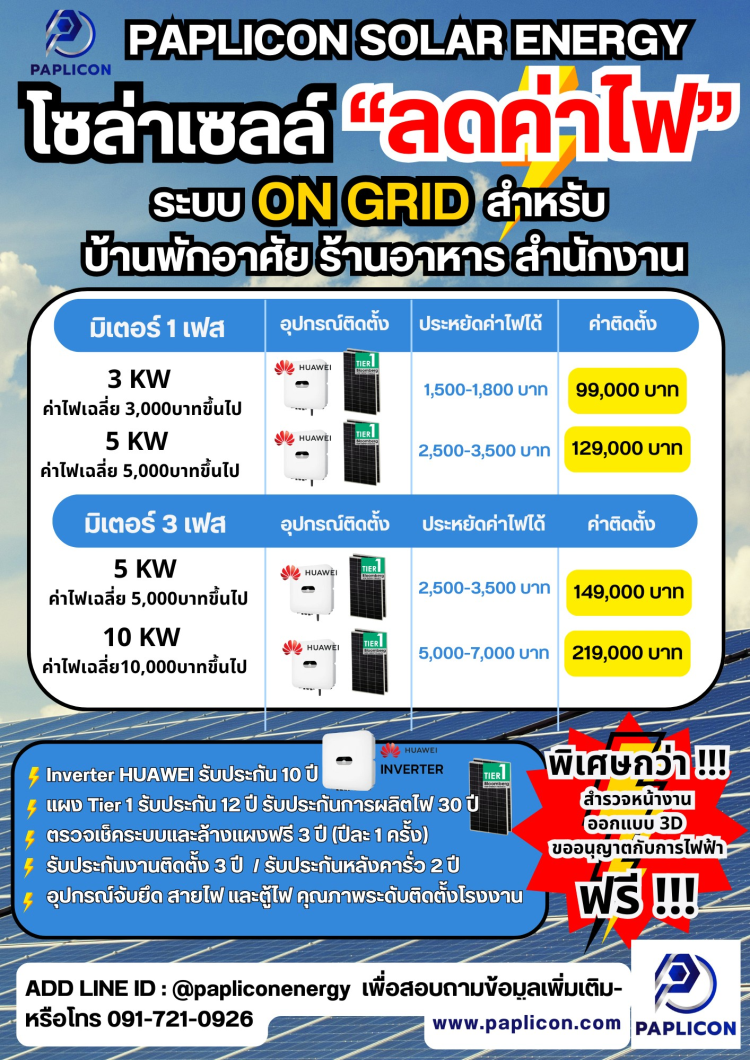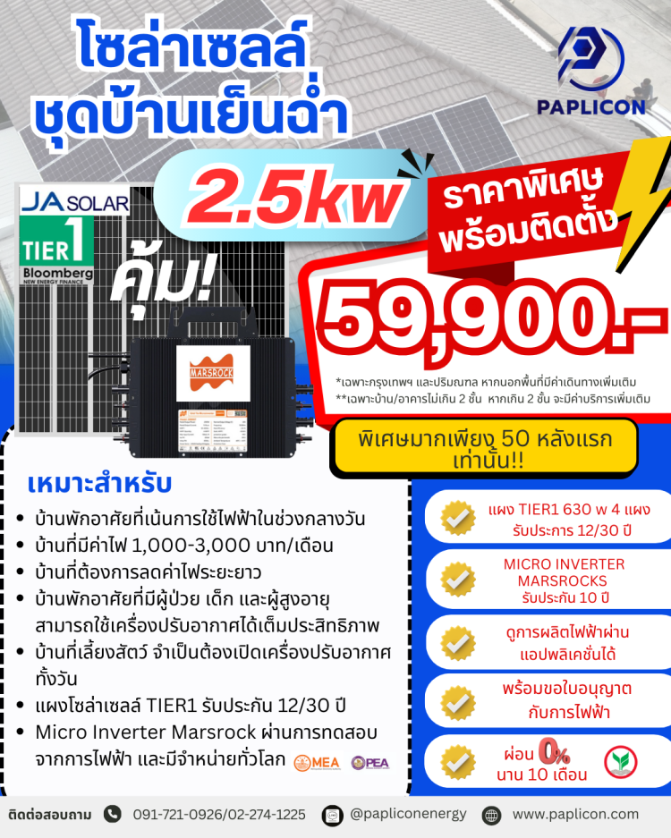 Paplicon Solar Energy ขอเสนอ Solar Cell ขนาดติดตั้งแบบชุดประหยัดด้วยขนาด 2.5 KW